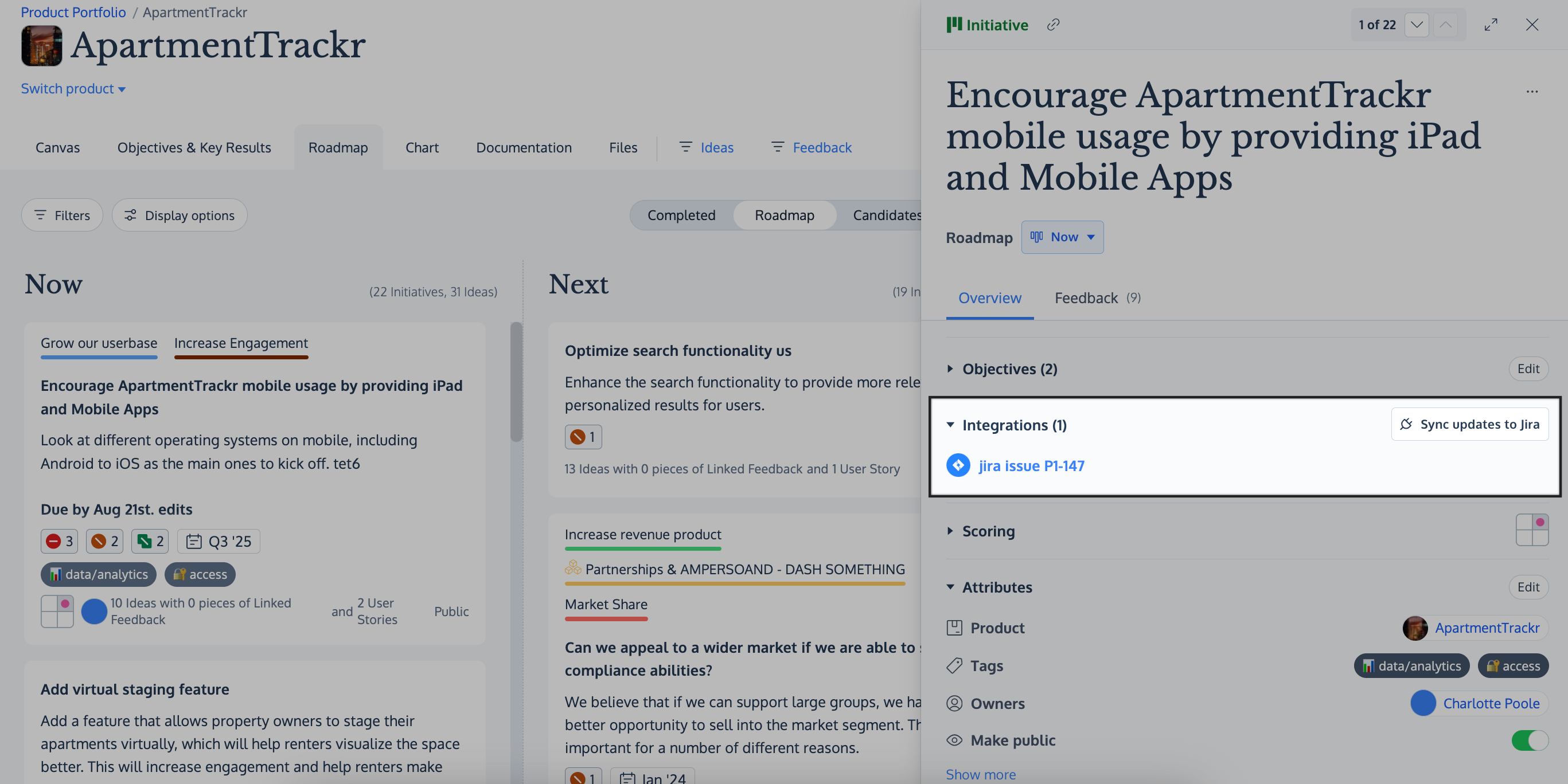 When you have an initiative that is ready to be pushed to Jira and kickstart your development project, go to your Roadmap and find the Initiative. Open the Initiative canvas, scroll to Integrations and click Push