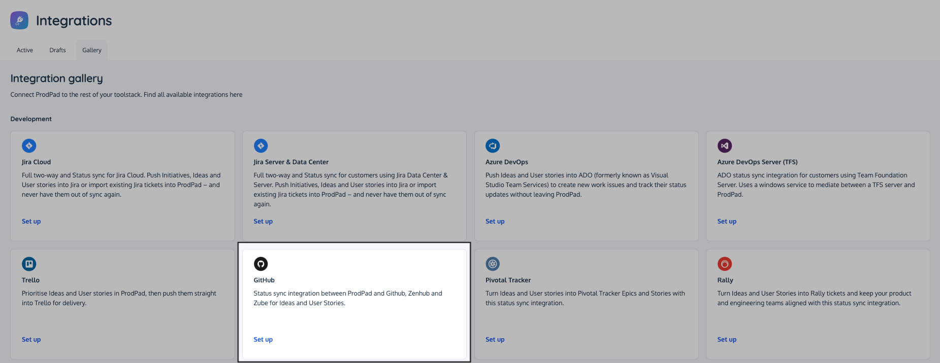 From the Gallery tab locate Development integrations, select Github from the list of options.