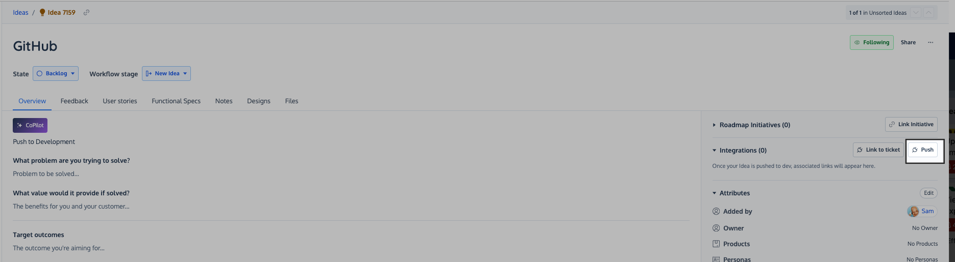 Now that you've got an active integration with Github set up, it's time to start pushing finished ideas from ProdPad to Github.