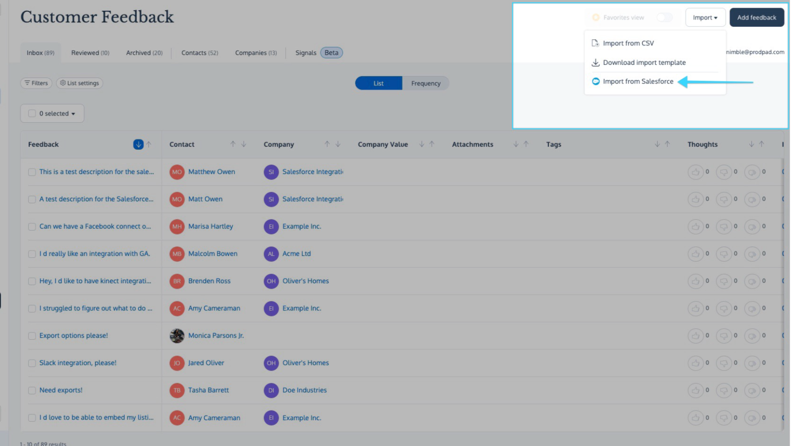 Now that you've got your integration set up, you can begin importing Salesforce Objects into ProdPad as Feedback.