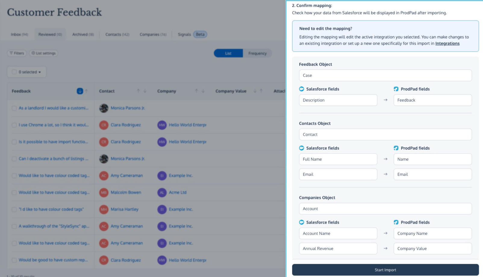 Once the integration is active, it will run once every 15 minutes from the hour (for example 1 PM, 1:15 PM, 1:30 PM, etc). When the integration detects new Objects in Salesforce that match the integration mapping options, it will import those Objects into ProdPad as Feedback. You can also choose to import any current Objects from Salesforce into ProdPad that match the integration mapping by selecting the Import option from the top right-hand side of the Feedback menu.You’ll next have the option to select the Salesforce integration you’d like to use for the import. A mapping confirmation screen will appear once you select the integration you'd like to use. This screen allows you to check that your mapping is correct before you import the Salesforce Objects into ProdPad as Feedback. When you’re happy with how your mapping options look, click the Start Import button to begin the import process.
