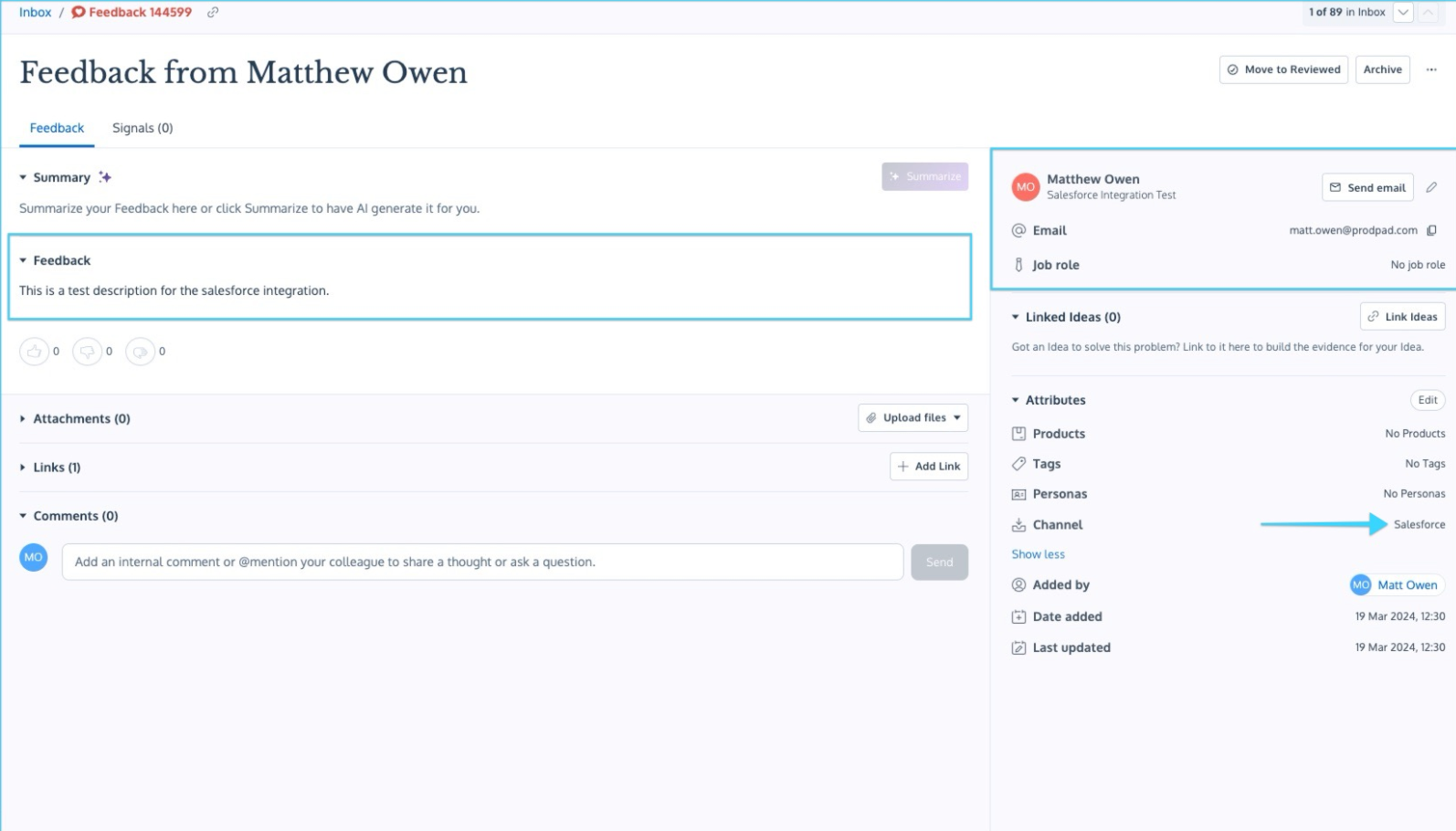 Once the Objects have been imported into Prodpad as Feedback, they will be displayed in the Inbox list. When opened, you will see that the Feedback title, description, contact, company, and email fields have been populated. The Feedback Channel will also be displayed as Salesforce.