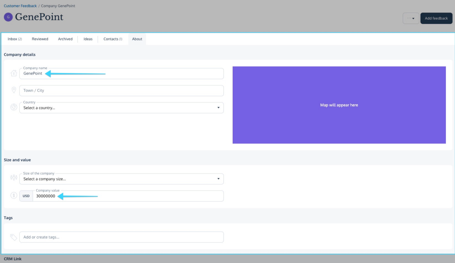 Lastly, if you chose to sync Companies from Salesforce to ProdPad in the Company mapping step, you can view the Companies by navigating to Feedback and clicking on the Companies tab or by clicking into the Company directly from within the Contact. From here, you will see that the Company Name field has been populated along with the Company Value.