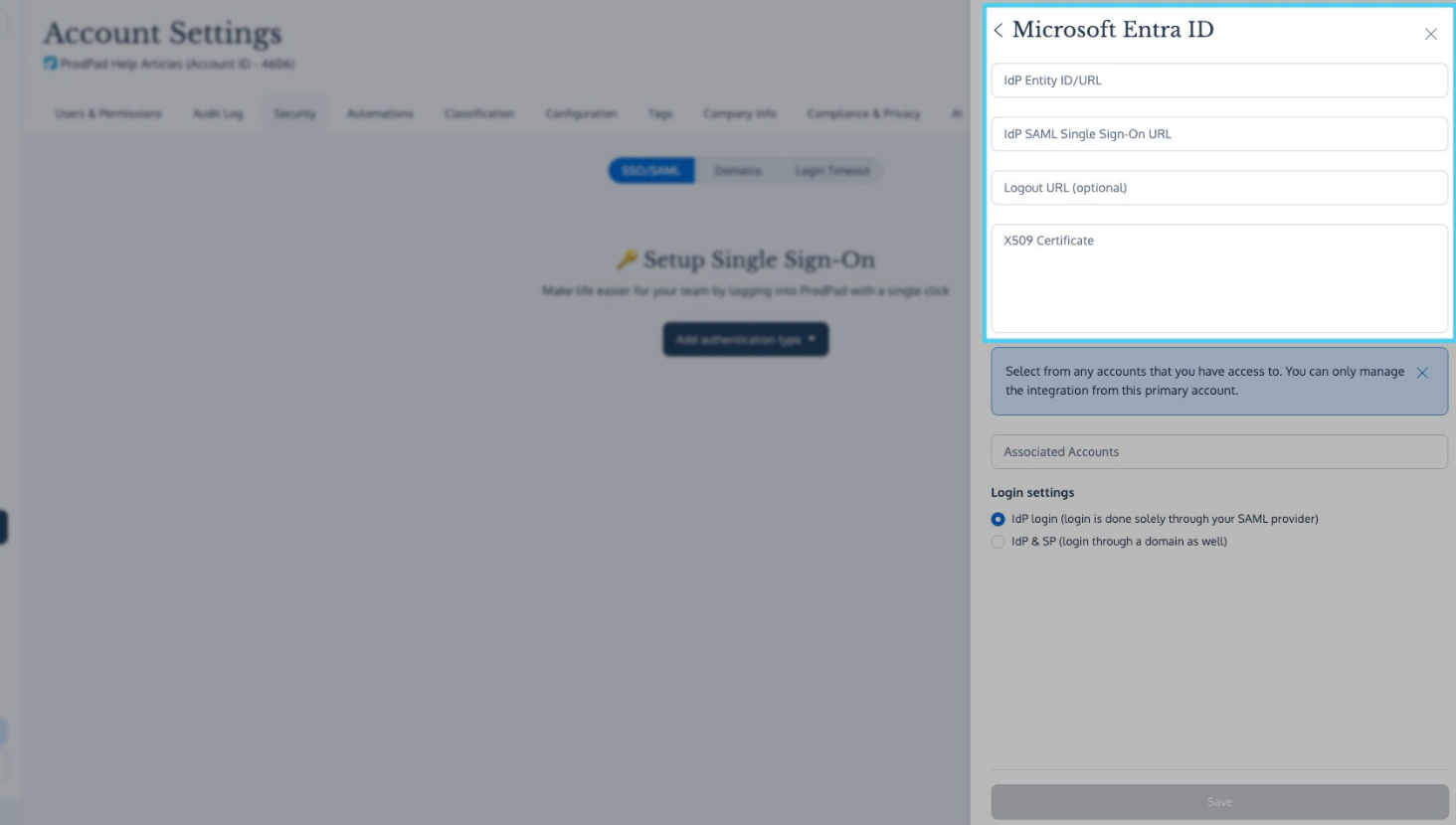 - If you select the IdP login (login is done solely through your SAML provider) option, you users must log in from the Microsoft Entra dashboard, rather than from the ProdPad login page.
