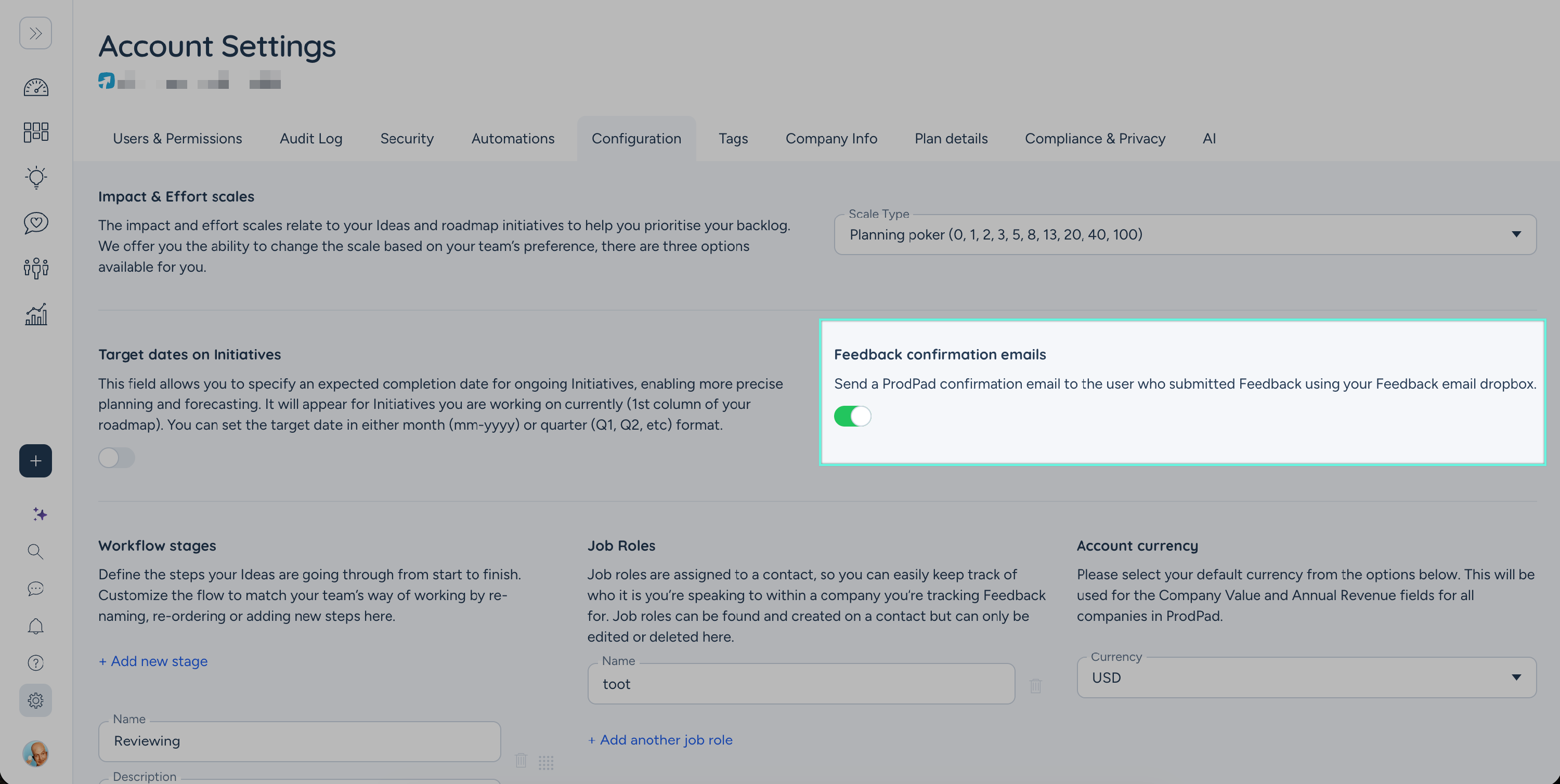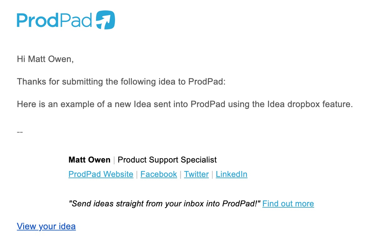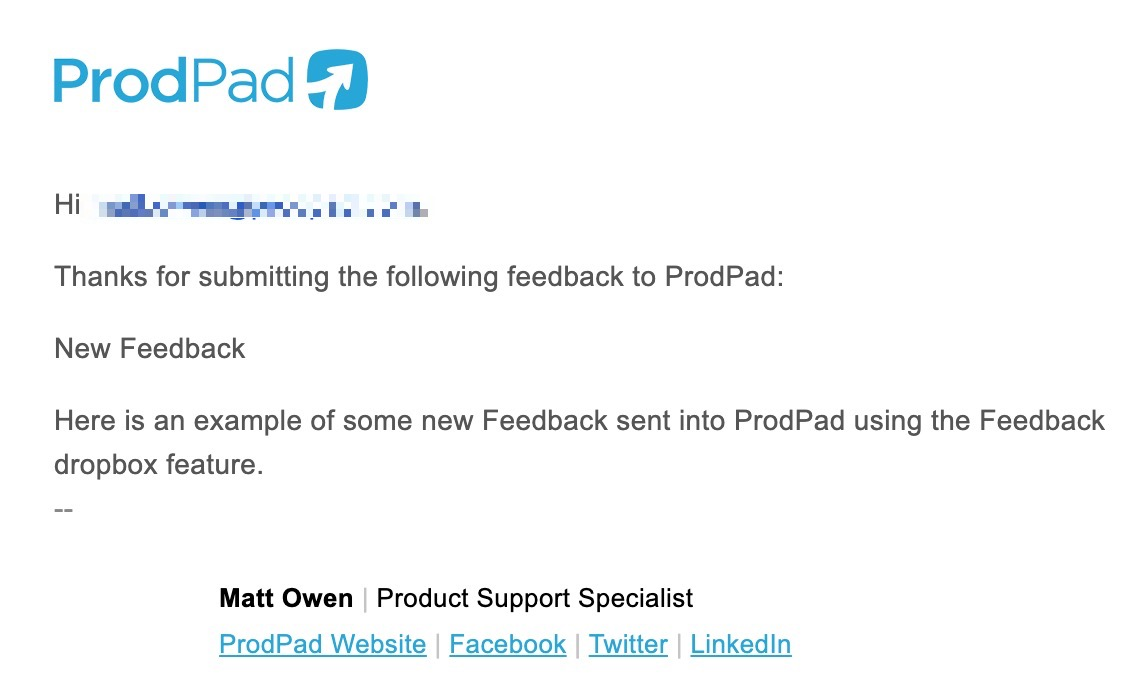For Ideas and Feedback submitted this way, ProdPad will send a confirmation email to the sender to confirm that the information was received and captured.